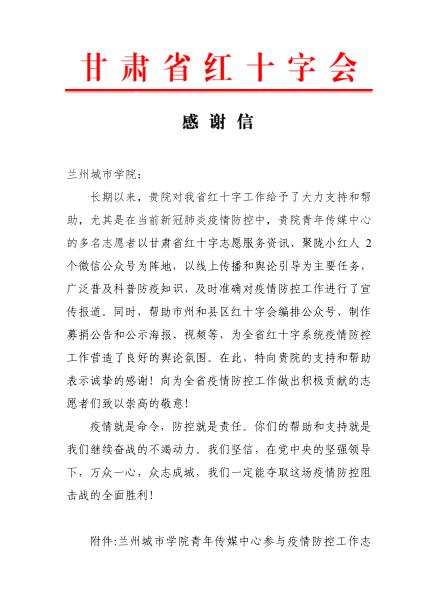 3月6日,beat365收到甘肃省红十字会发来的感谢信。信中对beat365青年传媒中心志愿者在疫情防控工作中的积极贡献给予充分肯定,对beat365提供的支持和帮助表示感谢。