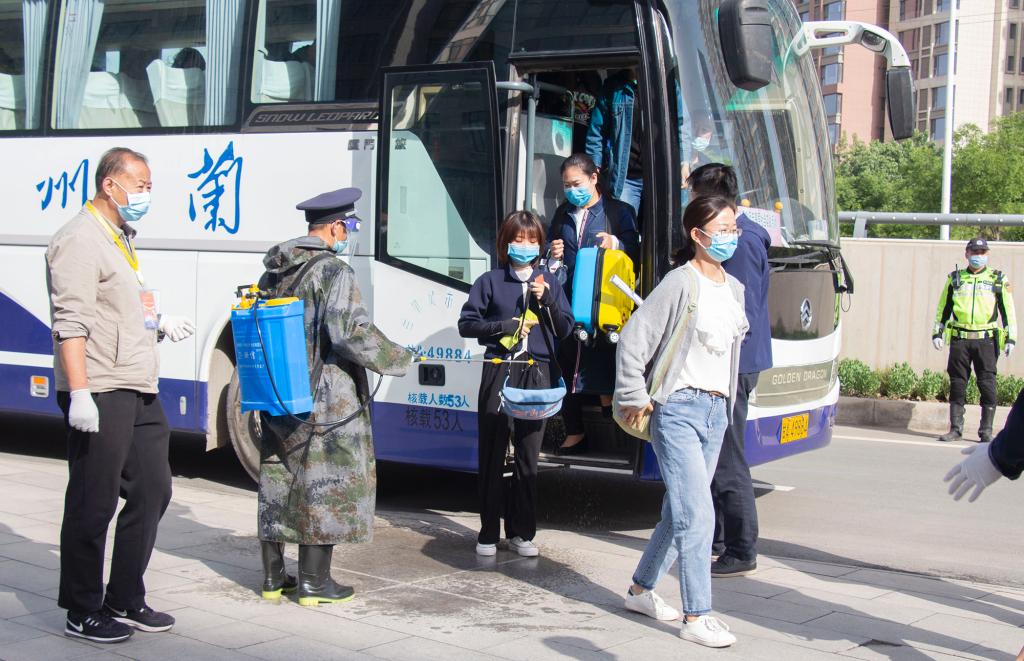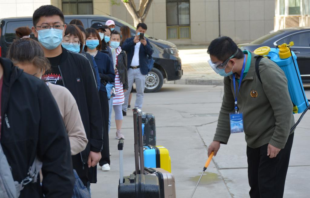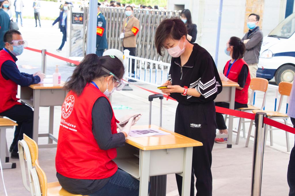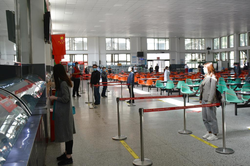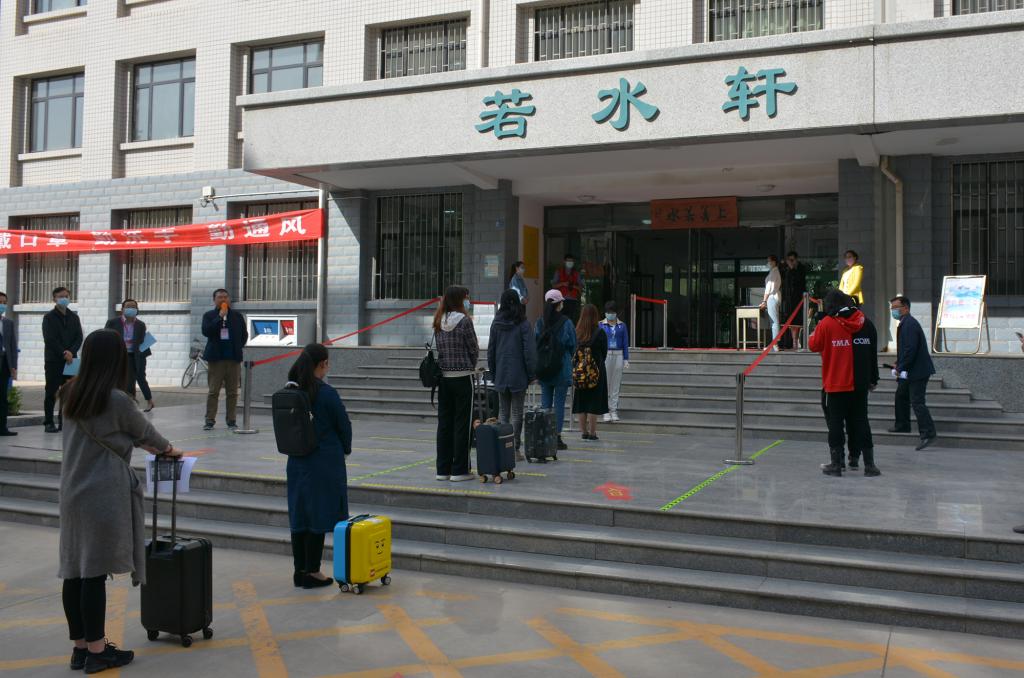 “接站乘车”场景中,扮演学生的教职工党员志愿者有序排队,接受手部和行李消毒,以及“健康码”、返校通行证检查后,在接站大巴车上间隔就座。在校门口,载着“返校学生”的大巴车和私家车徐徐驶来,在工作人员的引导下有序停车。“返校学生”下车接受手部和行李消毒后,间隔1米排队接受入校检查,经面部测温、查验“健康码”、扫描返校通行证、更换一次性口罩等程序后有序安全入校,在公寓门口再次检测体温、登记信息后入住。“餐厅就餐”场景中,就餐人员佩戴口罩,依次排队,在测温、手部消毒后有序进入食堂,按照引导标线排队取餐,按照“一人一桌一方向”原则落座就餐;“教室授课”情景中,“学生”根据课程安排,单人单桌落座,教师清点学生人数,做好考勤,师生全程佩戴口罩上课。演练中每个场景中都设置了学生体温异常等特殊情景,工作人员按照应急处置工作预案迅速有序地开展了应急处置。