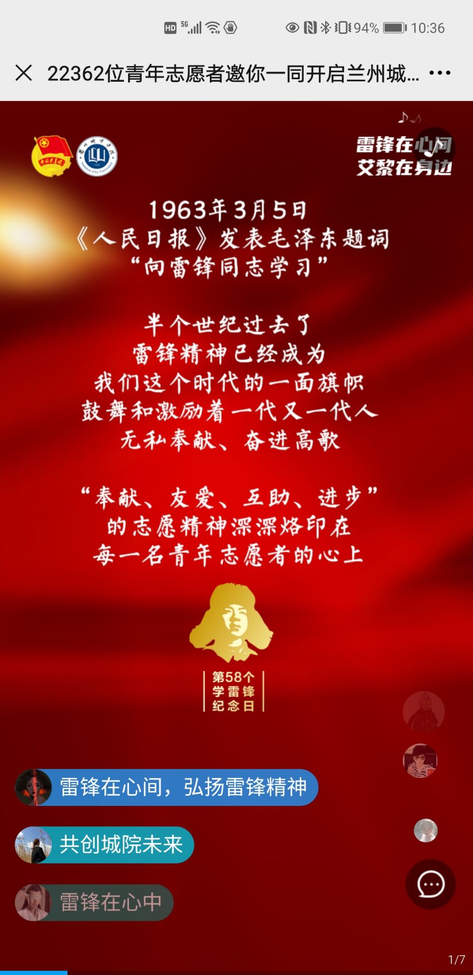 截至目前,已有22000余人参加了本次“雷锋在心间 艾黎在身边”志愿服务活动月网络启动仪式,并在微信朋友圈进行转发。在为期一个月的“雷锋在心间 艾黎在身边”志愿服务月活动中,各二级学院将结合专业特色开展以关爱农民工子女及留守儿童、阳光助残、邻里守望与为老服务、节水护水与水利公益、脱贫攻坚、恤病助医、环境保护、应急救援、禁毒教育与法律服务、文化宣传、理论研究、志愿服务支持平台和其他领域等13类志愿服务活动,在全校营造无私奉献、助人为乐的良好风尚,用实际行动汇聚新时代青年大学生的青春正能量。
