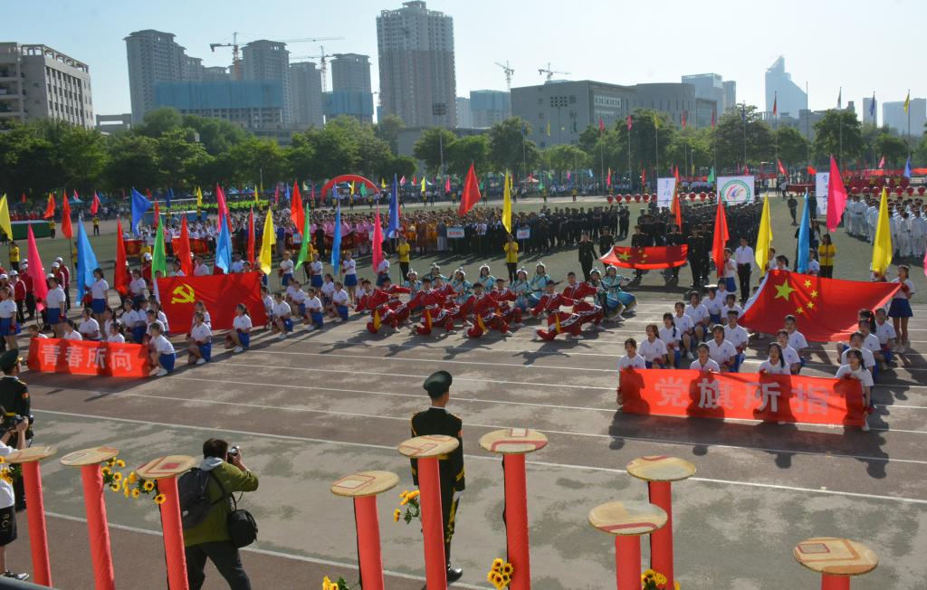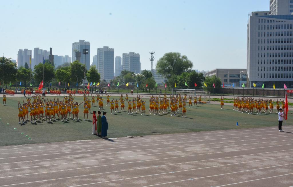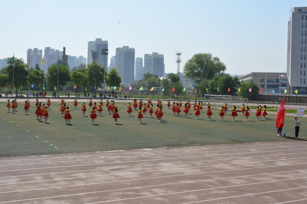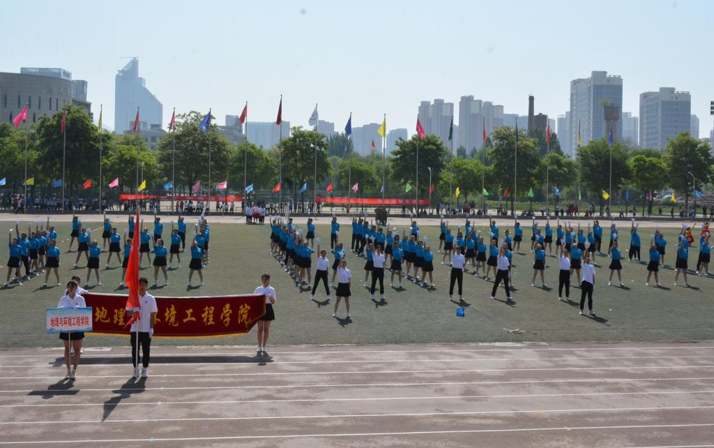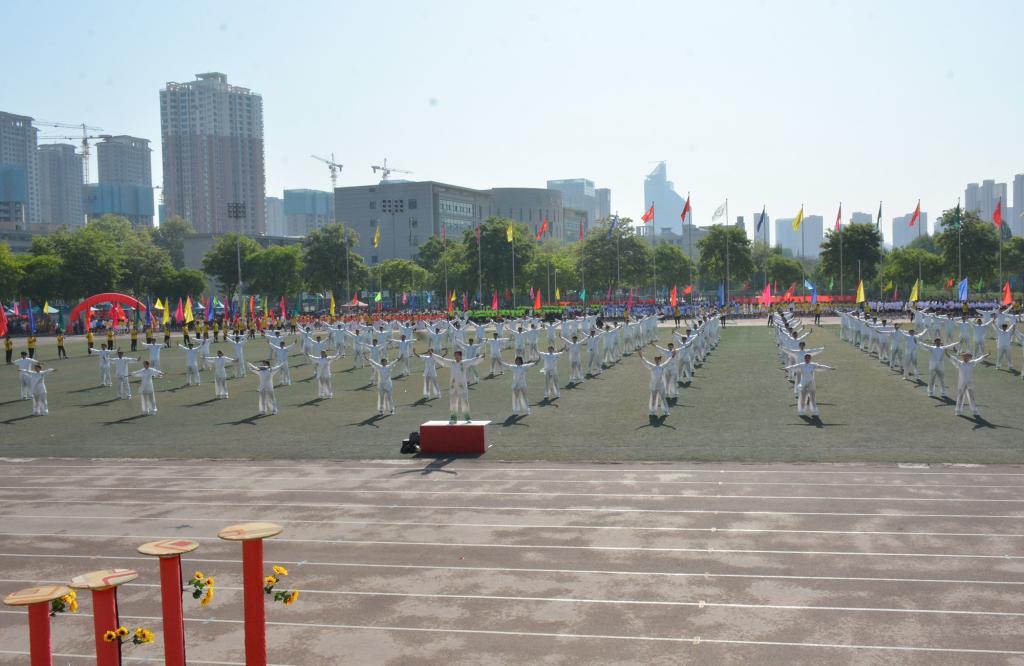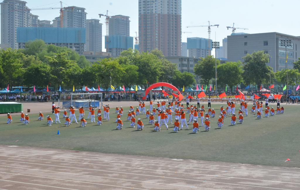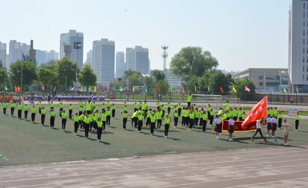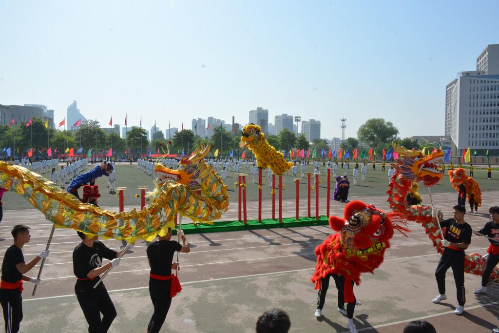 宋金彤、吴宇博分别代表全体裁判员、全体运动员宣誓。随后,体育学院师生带来了《武动盛世》表演,八段锦编排高雅精致,动作舒展优美,带着同学们一起领略了中华武术的博大精深;舞龙舞狮节目中,长龙狮子踏着鼓点上下飞舞、左右翻腾,营造出“瑞狮欢舞歌盛世,龙腾狮舞送吉祥”的喜庆氛围。17支团体操代表队分批登场,身着绚丽的服装,洋溢着自信的微笑,在“没有共产党就没有新中国”和“我们都是追梦人”的奋进旋律中,舞动青春、放飞梦想,充分展现阳光体育的精彩魅力和昂扬向上的精神风貌,将现场气氛推向了高潮。