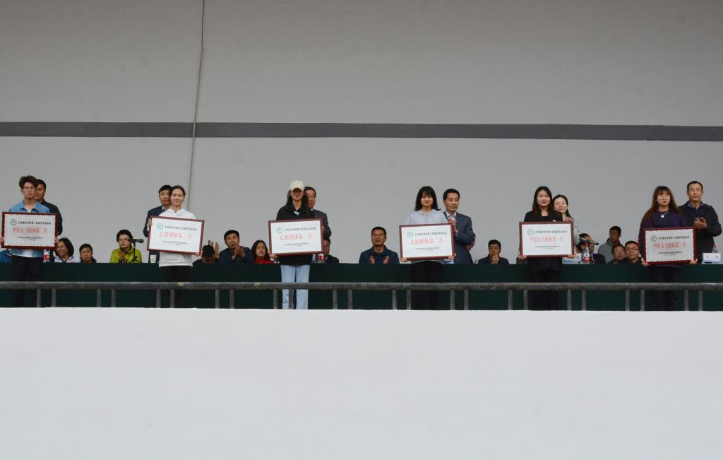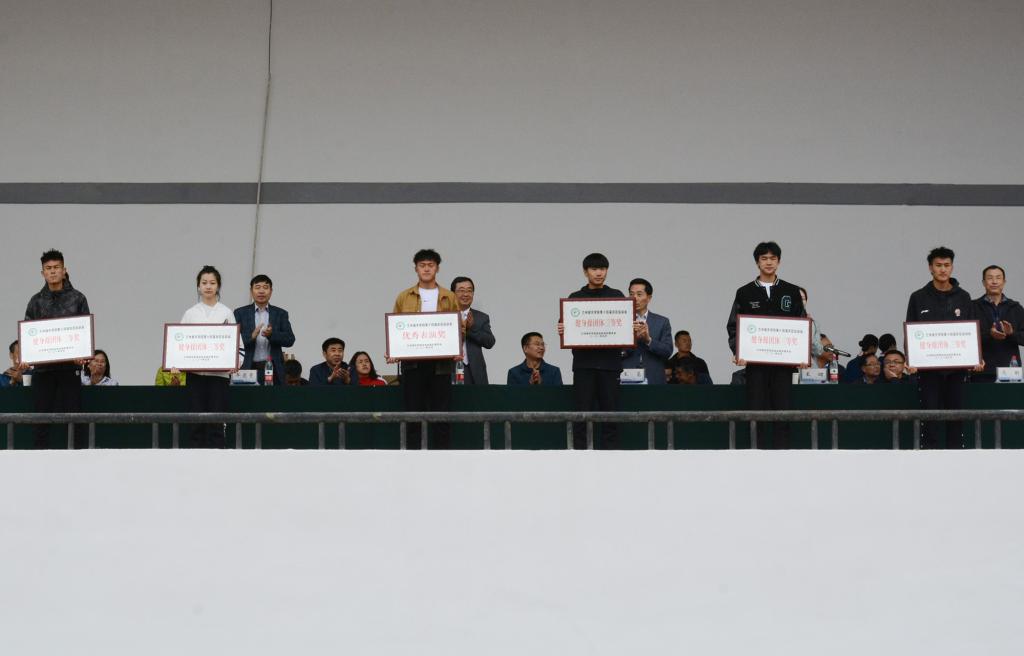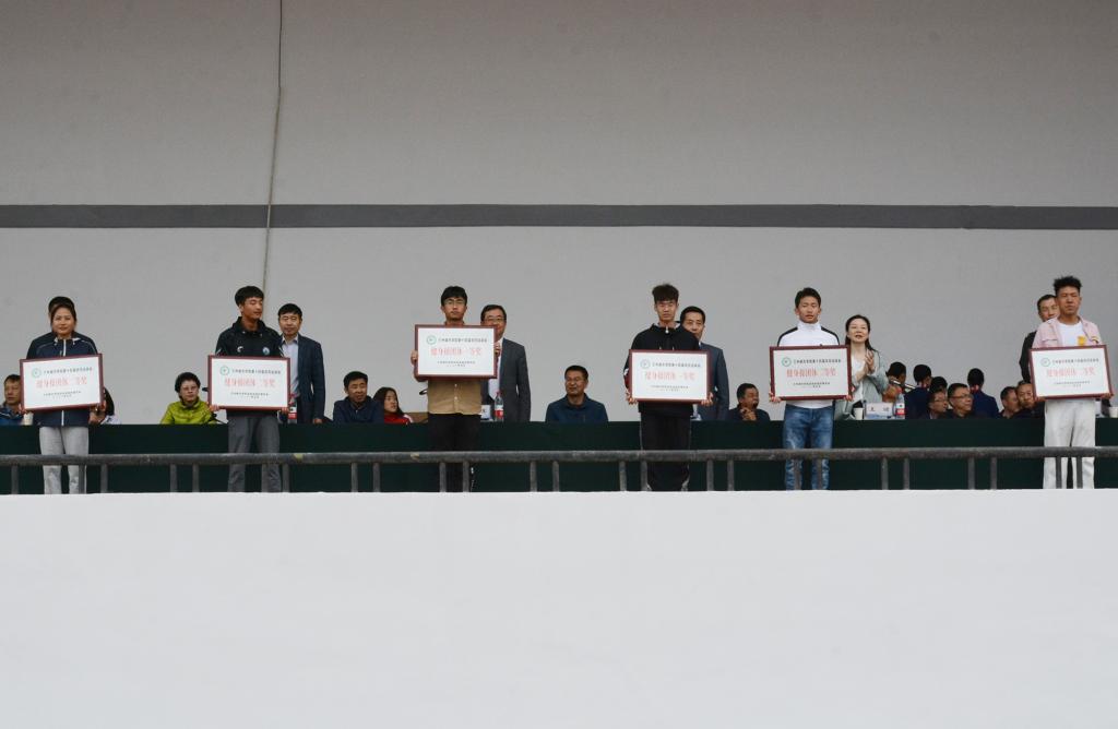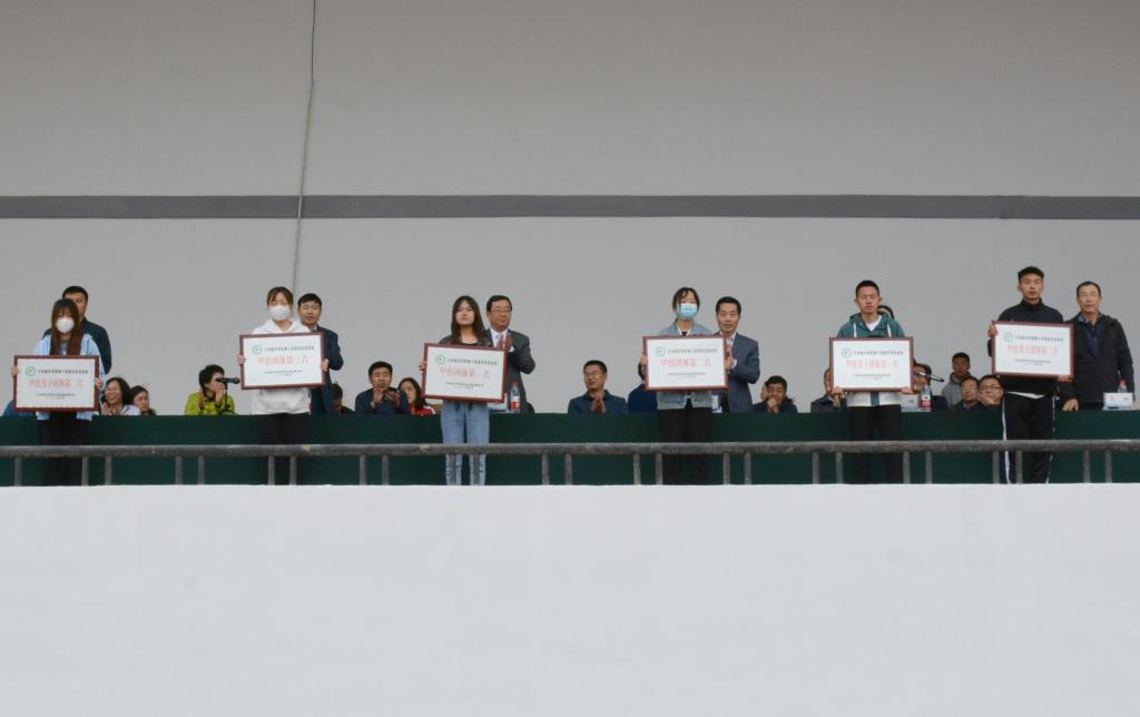 与会校领导为获奖集体和破纪录运动员颁奖。
