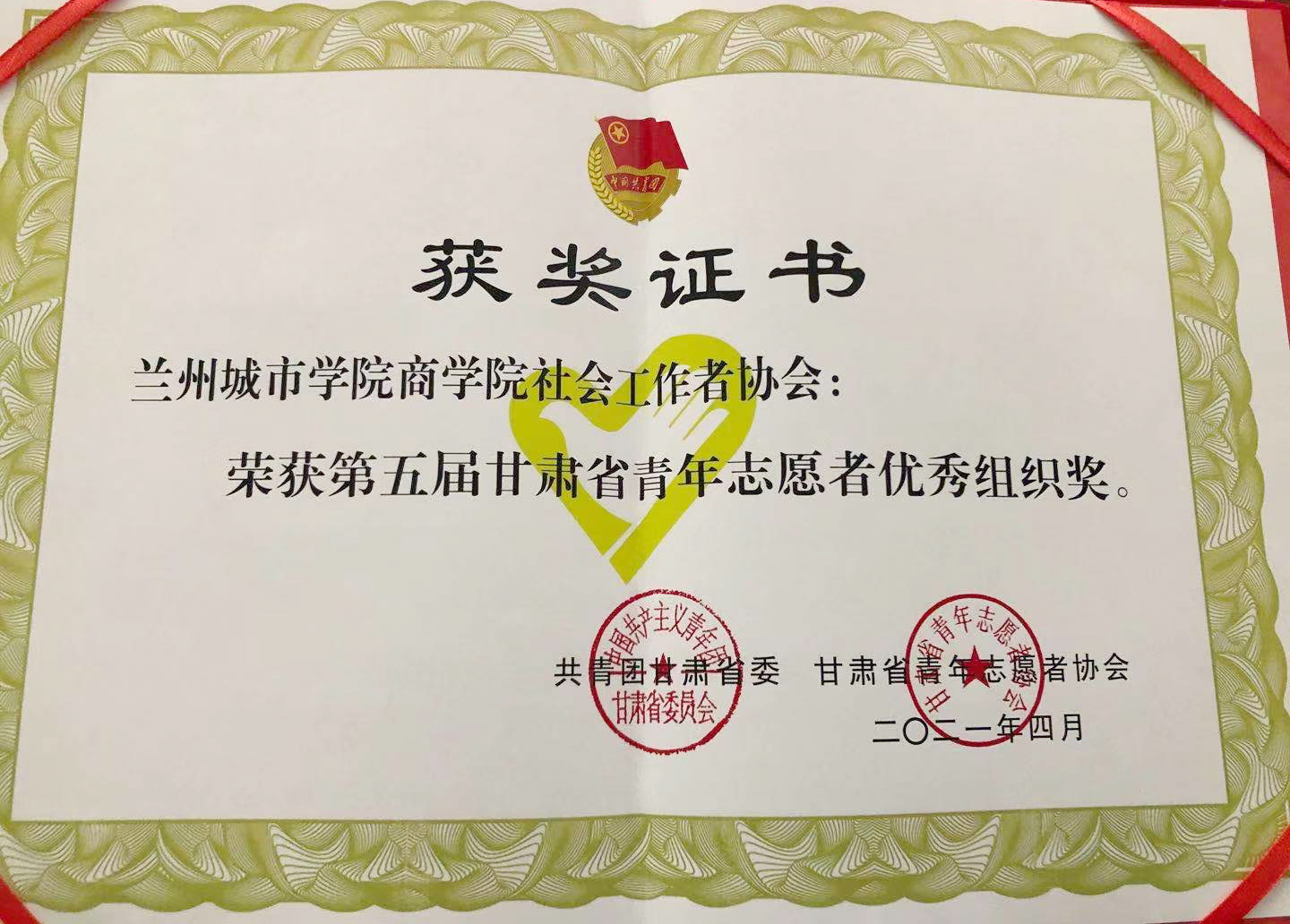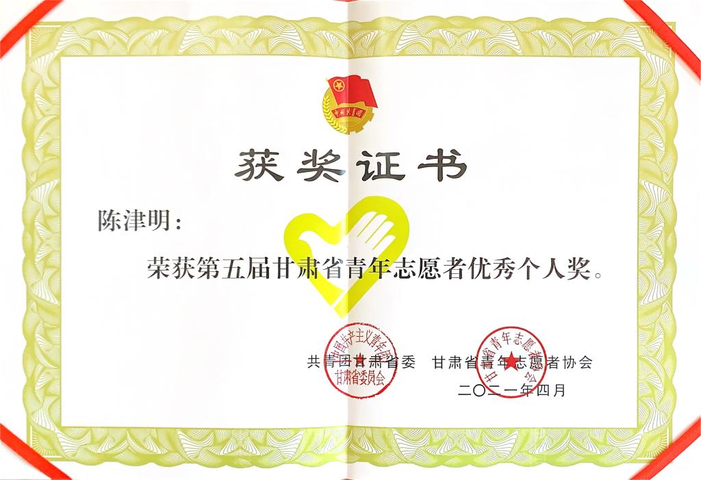 beat365商学院社会工作者协会荣获第五届甘肃省优秀青年志愿者组织奖荣誉称号,国际文化翻译学院陈津明同学荣获甘肃省第五届优秀青年志愿者荣誉称号。