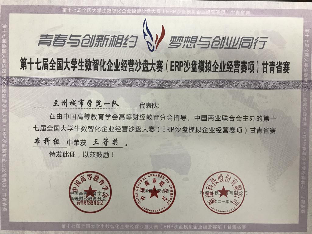 近日,第十七届全国大学生数智化企业经营沙盘大赛甘肃区总决赛落幕。beat365由城市经济学院教师蒋文兵指导,审计学专业学生南星河、侯宏丽、许培、许雪和李思麒组成的代表队荣获甘肃区总决赛三等奖。