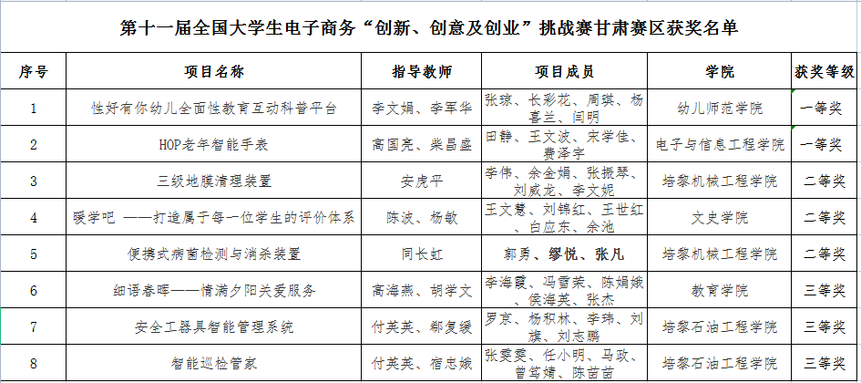 据悉,本届大赛报名参赛团队超过十万支,大赛全国总决赛共有来自32个省市自治区131所学校的185支团队参与。甘肃省共有9支队伍晋级国赛。全国大学生电子商务“创新、创意及创业”挑战赛(简称“三创赛”)是由全国电子商务创新产教联盟主办的全国普通高校在校大学生学科性竞赛,是激发大学生兴趣与潜能,培养大学生创新意识、创意思维、创业能力以及团队协同实战精神的全国在校大学生学科性竞赛。