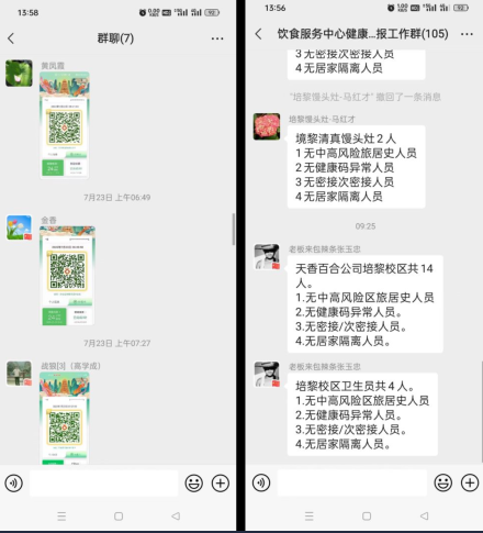 饮食服务中心第一时间积极与返家的食堂员工取得联系,精准摸排省内外和在兰的169名员工的健康状况,建立了食堂员工返家健康登记表、食堂从业人员台帐,督促员工积极配合当地做好返家后的健康报备、健康监测等健康管理措施,严格按当地要求做好疫情防控工作。各餐饮公司每天在饮食服务中心健康群上报员工的健康码和核酸检测,及时跟踪员工在异地的健康情况,做到离校不脱管,确保每一位员工生命安全和身体健康,筑牢疫情防控线。