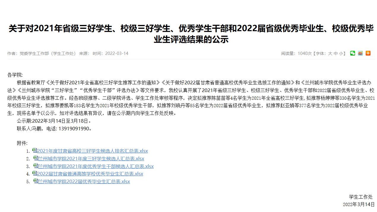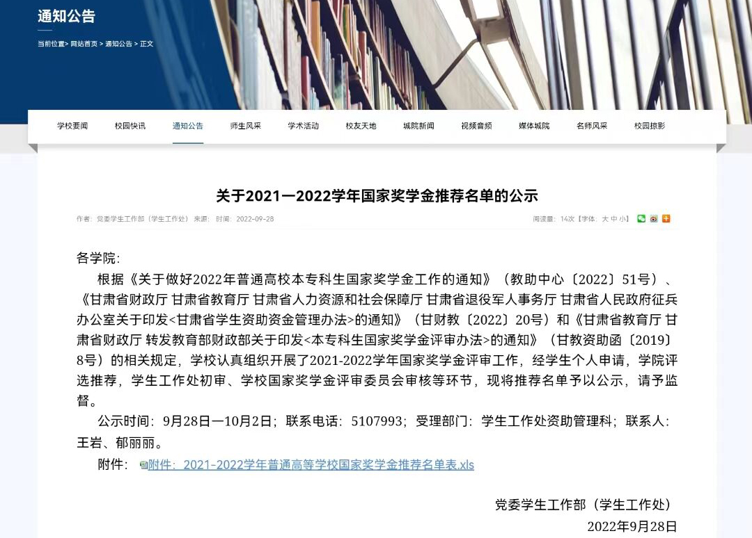 扎实推进资助育人。学校坚持“济困、励志、强能、感恩”的资助育人目标,扎实做好各类奖助勤贷补服务工作。共评定国家奖学金120人,发放金额96万元;国家励志奖学金2070人,发放金额1035万元;学校奖学金6420人,发放金额1026万元;国家助学金22035人,发放金额7487.7万元;入伍、退伍等其他奖励资助280人,发放金额392万元。学校聘任“学生资助宣传大使”,开展政策宣讲,丰富“助学筑梦铸人”等活动内涵,加强受资助学生励志教育、诚信教育和社会责任感教育,努力实现资助育人工作从“以经济资助为主”向“资助育人相结合”的转变,学校荣获“甘肃省生源地信用助学贷款和高校资助工作先进单位”称号。