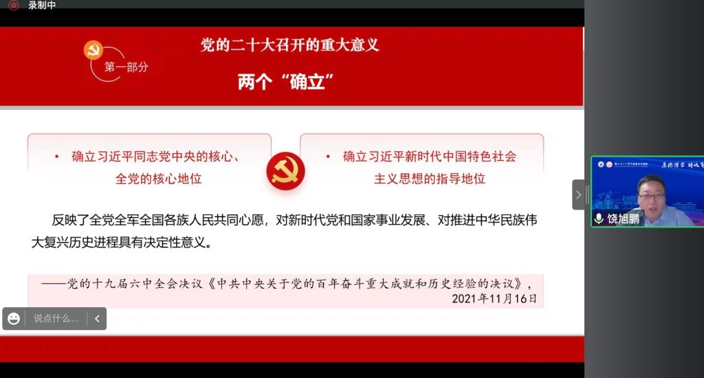 11月24日,学校通过线上方式召开党委理论学习中心组扩大学习会暨党的二十大精神轮训班首场报告会,全省学习贯彻党的二十大精神专家学者宣讲团成员、兰州理工大学马克思主义学院院长饶旭鹏教授,应邀作专题辅导报告。全体校领导、党委常委,校党委委员,全体处级干部,马克思主义学院教师和全校党支部书记参加会议。校党委书记许尔忠主持会议。