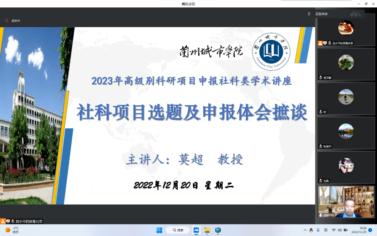 12月20日下午,学校召开了2023年社科类高级别科研项目申报辅导会。校长曹洁主持会议.会议邀请莫超教授以视频形式作题为《社科项目选题及申报体会摭谈》的专题报告。社科类二级学院院长和主管科研工作副院长、高级职称教师及博士、科技处全体等170余人参会。