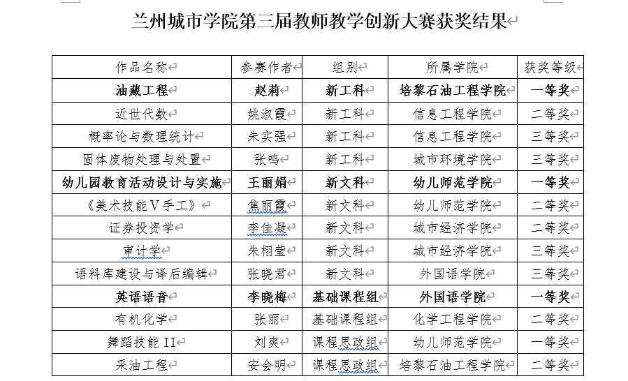 本届比赛参照第三届全国教师教学创新大赛赛制,分新工科、新文科、基础课程和课程思政四个赛道,经过院级初赛、校级网上评审,历时4个月,共计22位教师进入校级复赛现场评审阶段,创下本项赛事自开办以来参赛教师人数最多、覆盖面最广的记录。经过评审专家现场评审,新文科组王丽娟等13人获校级一、二、三等奖,同时推荐新文科组王丽娟、新工科组赵莉、基础课程组李晓梅三位教师代表学校参加省级比赛。