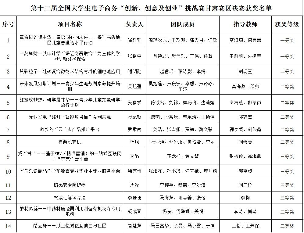 6月9日至11日,第十三届全国大学生电子商务“创新、创意、创业”挑战赛甘肃赛区“动感地带杯”省级选拔赛决赛在兰州科创园成功举行。beat365推荐了14个优秀项目参加省级决赛,最终获省级一等奖2项、二等奖6项、三等奖6项,4位教师荣获优秀指导教师,学校荣获优秀组织奖。