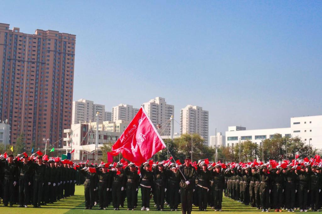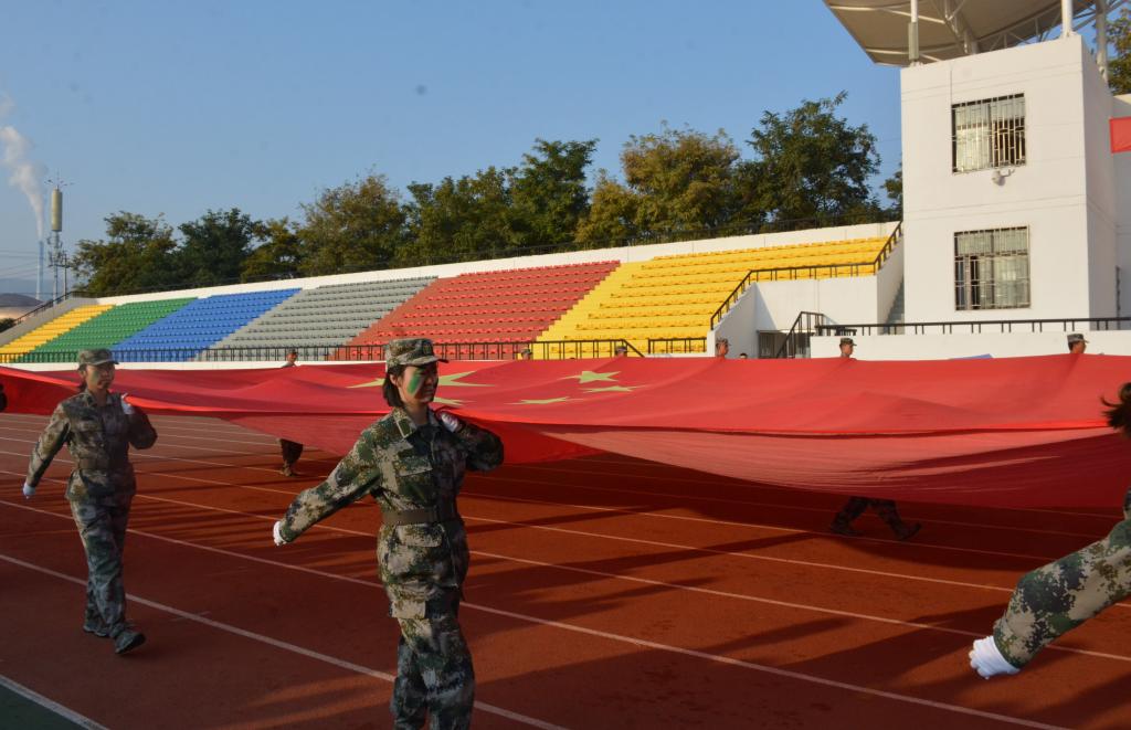 会议结束时,全体师生挥舞红旗,激情合唱《歌唱祖国》。伴着歌声,一面巨幅五星红旗在队列中缓缓展开,飘动的红旗,悠扬的旋律,表达了全体师生对伟大祖国的深切热爱。