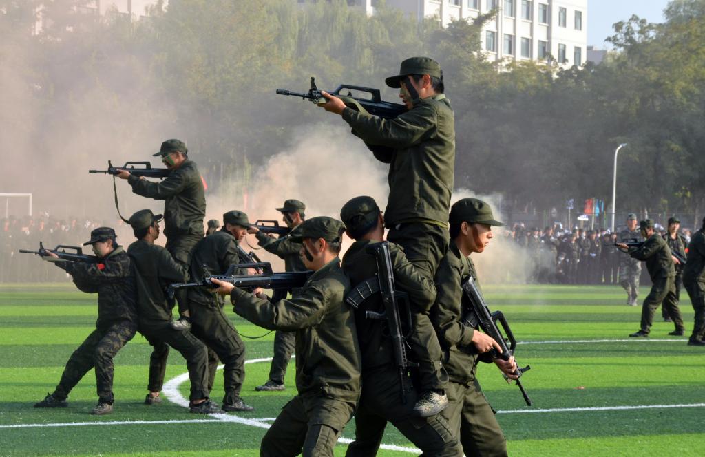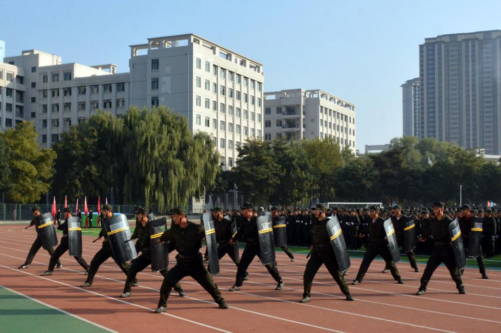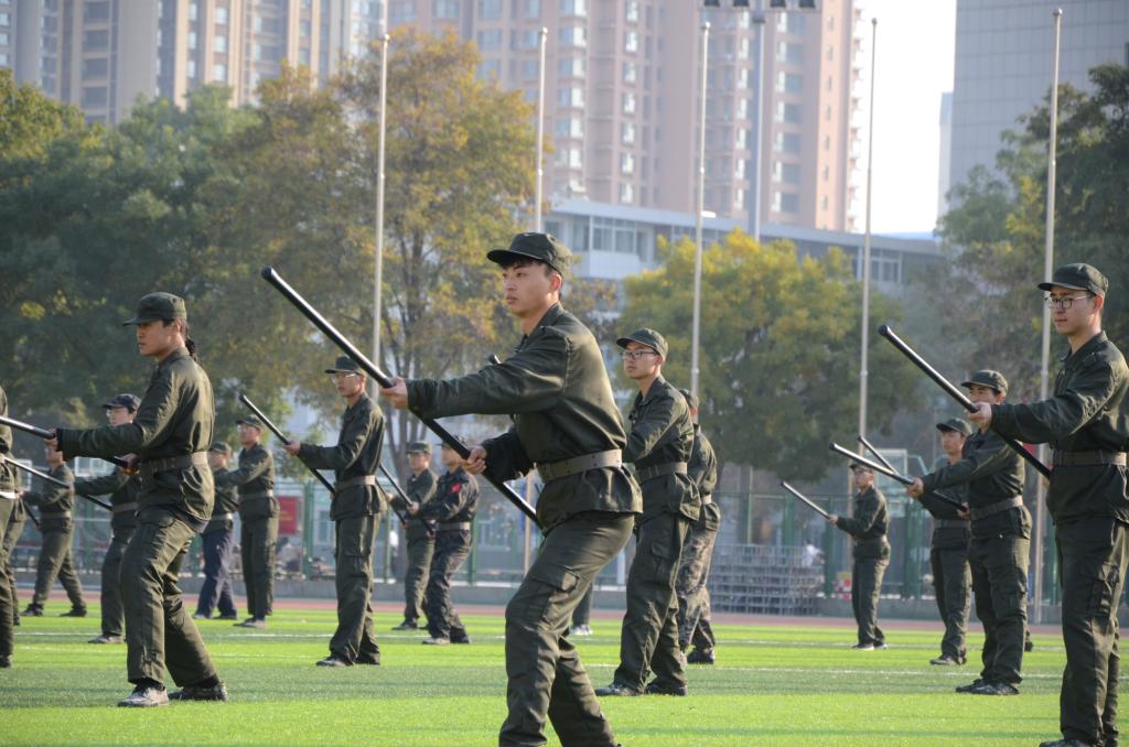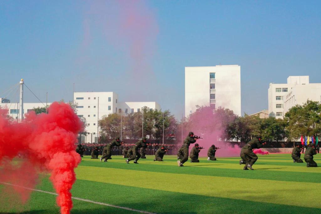 伴随着激昂的进行曲, 2022级学生军训总结汇报表演正式开始。军事训练科目展示中,各方阵依次展示了“队列会操”“军体拳”“擒敌拳”“应急棍术”“战术配合”“警棍盾牌术”等科目。展演现场,各方阵军容严整、姿态端正、口号嘹亮、步伐整齐,气势磅礴、震撼人心,参演同学们英姿飒爽、斗志激昂,每个动作铿锵有力,每句口号回荡天际。青年学子们用汗水与坚持展现着新一代城院学子的坚定信念,传承中华儿女的光荣使命。