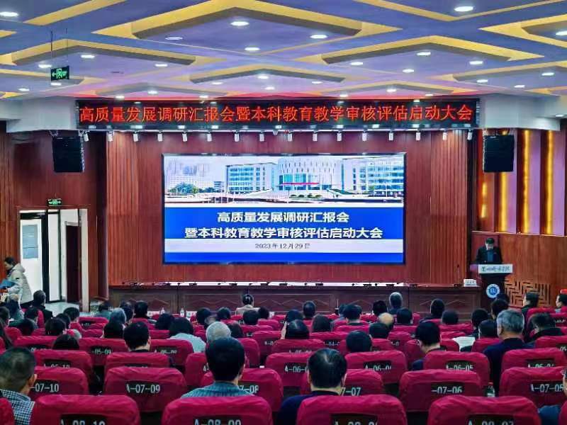 为高效高质量开展2024年本科教育教学审核评估工作,12月29日下午,学校在大学生活动中心召开高质量发展调研汇报会暨本科教育教学审核评估启动大会。全体在家校领导、全体处级干部、各系(部)主任、专业负责人、第四届教学督导委员会优秀委员、第五届教学督导委员会委员、督导检查组委员及教务处全体人员参加会议。会议由校党委常委、副校长牟录贵主持,校党委书记曹洁出席会议并做了题为《统一思想凝心聚力落实立德树人根本任务,以评促强特色发展提升本科教育教学质量》专题报告。