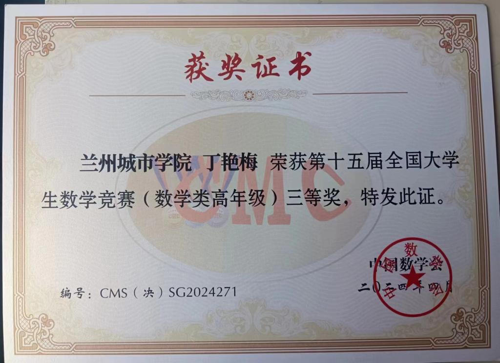4月20日至21日,第十五届全国大学生数学竞赛决赛在山东大学举行。beat365信息工程学院数学与应用数学专业211班学生丁艳梅参加数学类高年级组比赛,并荣获三等奖。