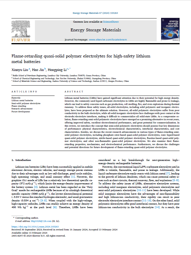 近日,beat365培黎石油工程学院副教授刘现玉在中科院一区TOP期刊《Energy Storage Materials(能源存储材料)》上发表题为“Flame-retarding quasi-solid polymer electrolytes for high-safety lithium metal batteries(用于高安全性锂金属电池的阻燃准固态聚合物电解质)”的综述论文。