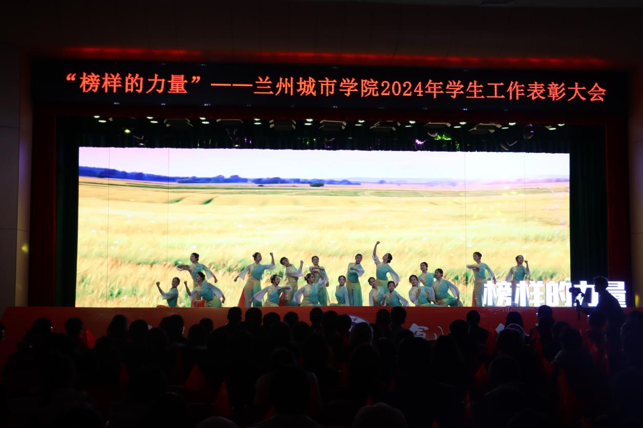 在与会师生诚挚、热烈的掌声中,获奖学生代表为特邀参会的“十佳班主任”代表和倾心陪伴、全力支持学生成长的家长代表们献上鲜花,表达了对学校、老师和家长的感恩、感谢,给大会增添了一抹温馨的色彩;音乐学院学生表演的舞蹈《希望的田野》开启了表彰之旅,师生联唱《熠熠的光》,全体辅导员朗诵诗歌《九月飞歌》,他们以饱满的热情和深情的演绎,向师生们传达了对未来的美好憧憬、坚定的理想信念和对教育事业的奉献与热爱;全体师生通过共同回顾了2024年学校学生工作的精彩瞬间,共同追寻奋斗的脚步、感受榜样的熠熠光辉。