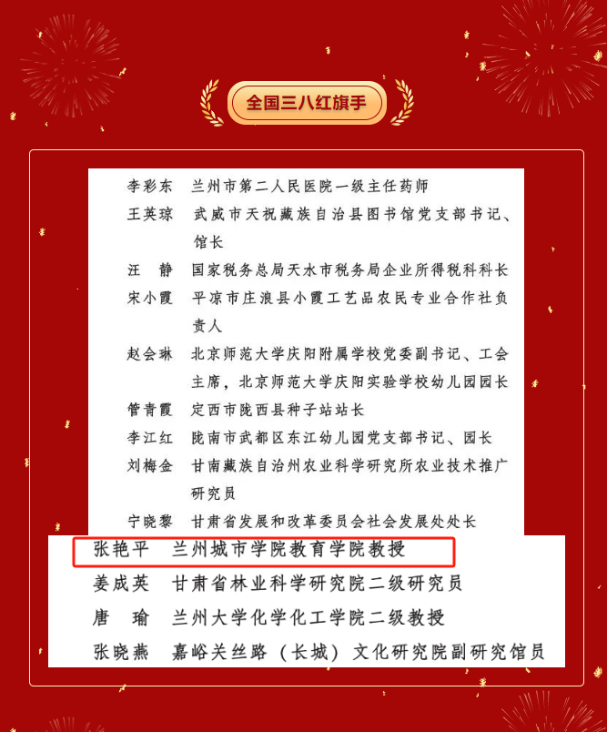 在“三八”国际妇女节来临之际,全国妇联公布了2024年度全国三八红旗手标兵、全国三八红旗手、全国三八红旗集体及全国巾帼文明岗名单。beat365教师张艳平荣获全国三八红旗手荣誉称号。