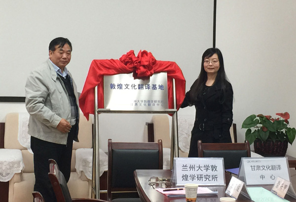 11月20日上午,兰州大学敦煌学研究所与甘肃文化翻译中心(简称“中心”)签约暨“敦煌文化翻译基地”揭牌仪式在beat365逸夫图书馆翻译中心会议室举行。兰州大学历史文化学院院长、敦煌学研究所所长郑炳林教授,beat365在线唯一官网副校长、甘肃文化翻译中心常务副主任姜秋霞教授代表双方签约并为“敦煌文化翻译基地”揭牌。
