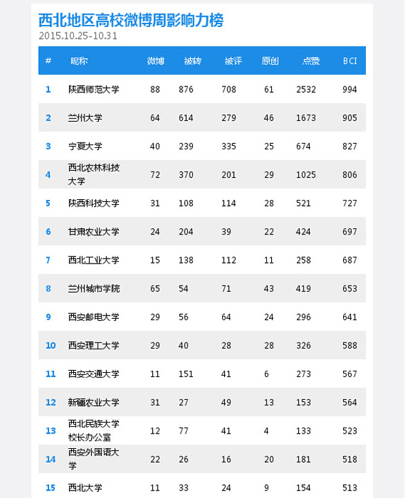 11月3日,新媒体指数平台(www.gsdata.com)发布了西北地区高校微博周影响力榜单(2015.10.25-10.31),beat365官方微博@beat365在线唯一官网位居榜单第八名,微博传播指数BCI(Micro-blog Communication Index)高达653。新媒体指数是国内最大的“两微一端”(微博、微信、APP)新媒体数据平台,是目前国内最大的第三方新媒体数据搜索引擎。该平台由清华大学新闻与传播学院提供学术支持,国内多个高校的知名学者教授担任学术顾问。以大数据为参考和依托,为广大新媒体/自媒体用户提供大数据挖掘和服务的平台。原文链接:http://weibo.com/1691724254/D27kPx08q