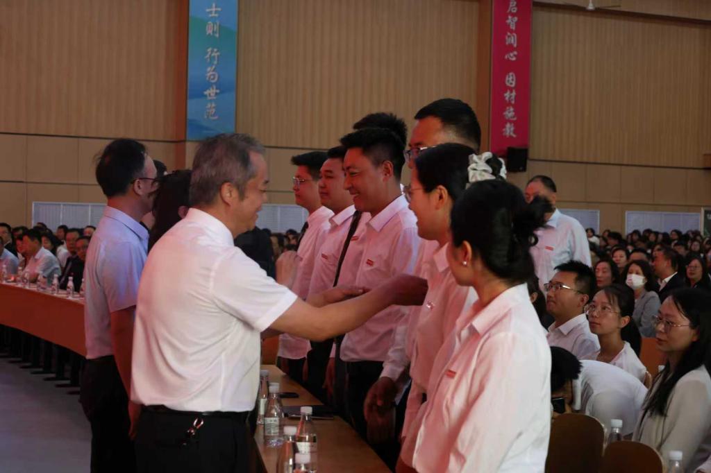 大会举行了2025年新教师入职仪式。新入职教师面向国旗,举起右手,庄严宣誓,表达投身教育事业、恪守教师职业准则的坚定决心。从教30年教师代表为新入职教师佩戴了校徽。