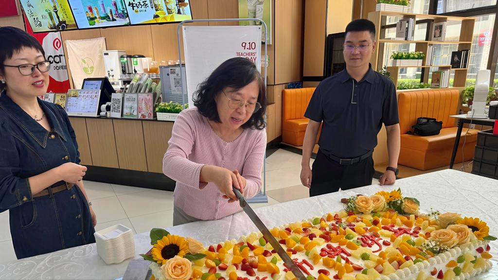 上午,各校区食堂提前准备好蛋糕制作食材,餐饮公司专业人员现场指导学生为教师制作节日蛋糕。同学们将精心装饰的蛋糕赠送给前来就餐的教职工,表达对老师们辛勤工作的感激之情。活动现场气氛温馨,教师们欣然接受这份特殊的节日礼物,共同分享节日的甜蜜与喜悦。
