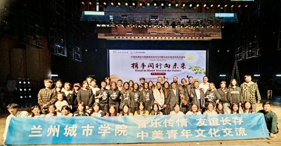 方忠义与音乐学院、外国语学院60余名学生到场观看两省州友好关系40周年民族专场音乐会《携手同行向未来》。音乐会由美国俄克拉何马州“马掌路”乐队与甘肃省歌舞剧院民族乐团联袂演出,中美艺术家共同演绎经典曲目,音乐会在全场齐唱《友谊地久天长》的感人氛围中落下帷幕。