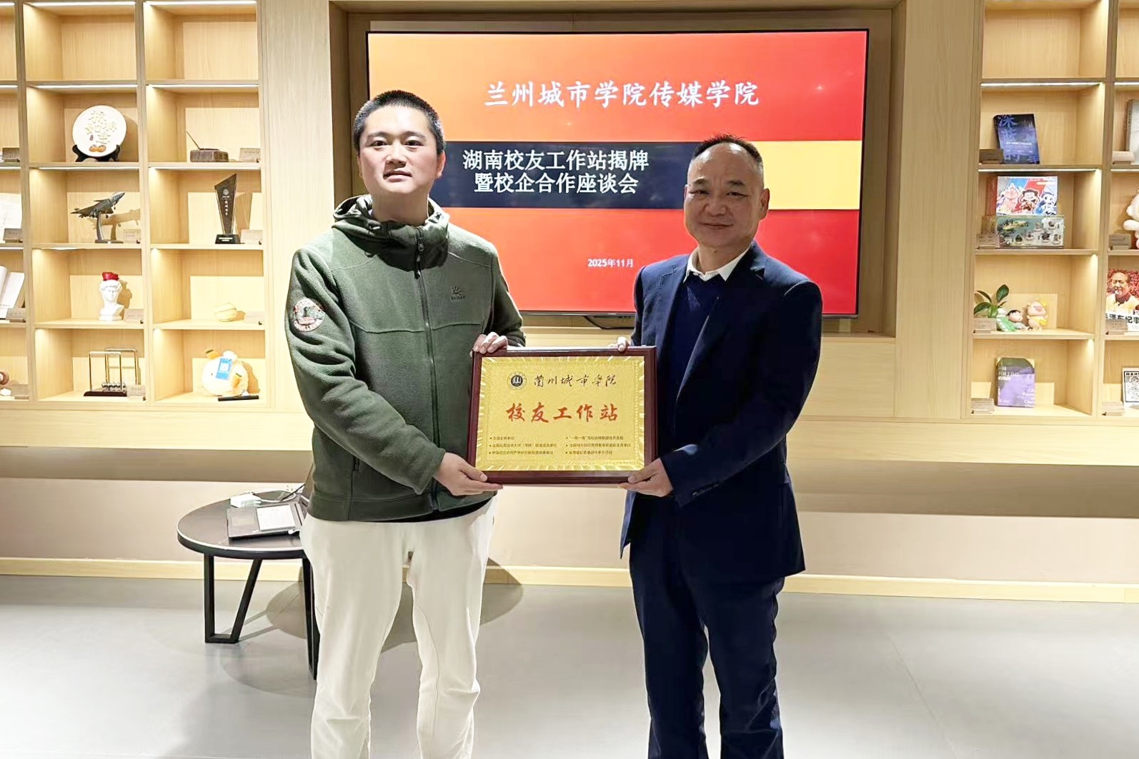 在湘潭大学艺术学院,双方围绕学院品牌活动打造与学科特色凝练进行了深入交流,探讨了通过差异化发展提升办学影响力的有效路径。在长沙学院马栏山新媒体学院,团队重点学习了硕士点申报建设、研究生培养模式创新及产教融合的实践经验,特别是该校依托马栏山视频文创园实现资源共享、产学研一体化的创新做法。调研期间,学院在湖南沙典文化传媒有限公司举行校友工作站授牌仪式,为优秀毕业生、公司负责人授牌,并召开校友座谈会。双方围绕实习就业、项目合作等话题展开深入交流,进一步完善了异地校友联络机制,搭建了校地人才交流平台。