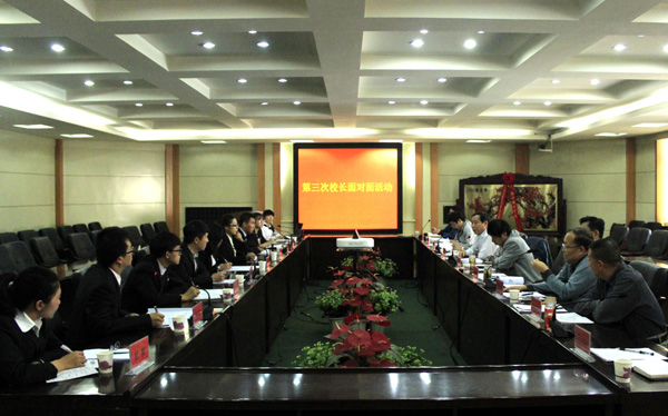 9月17日下午,beat365第三次“校长面对面”活动在校本部综合楼第一会议室举行。校长王汝锋,校办、教务处、学生处、招生就业处、后勤管理处、图书馆、膳食处、保卫处、团委等相关部门负责人和9名学生校长助理参加了见面会。