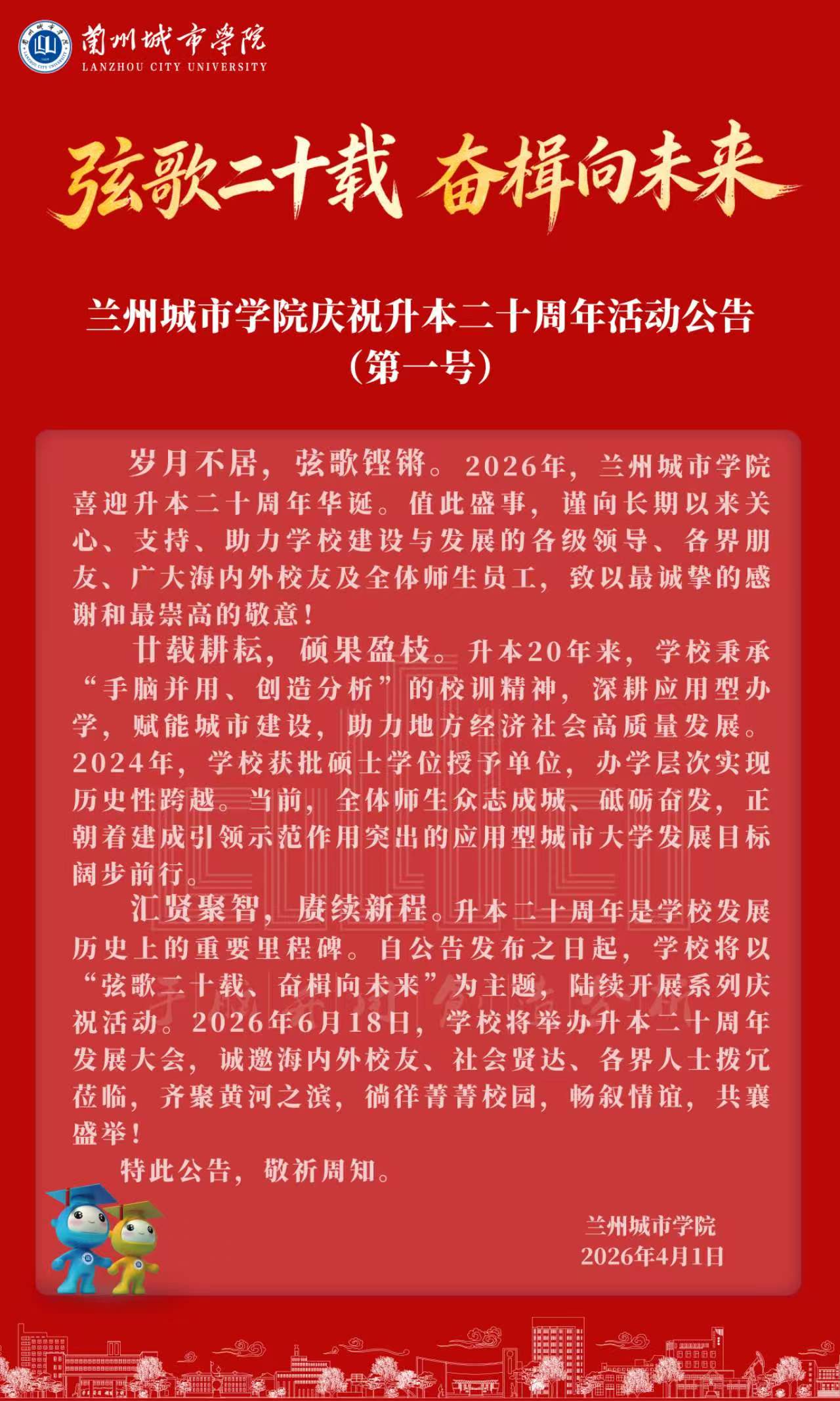 弦歌二十载 奋楫向未来 | beat365在线唯一官网庆祝升本二十周年活动公告(第一号)