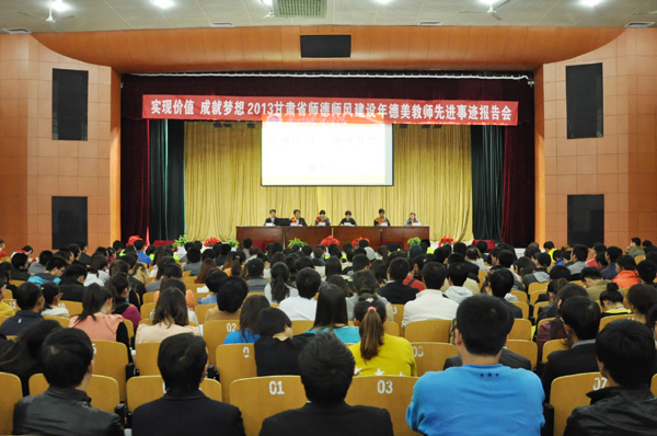 1019,以实现价值、成就梦想为主题的2013甘肃省师德师风建设年德美教师先进事迹报告会在beat365举行。省教育厅副厅长王萍出席并讲话,beat365党委常委、副校长马振林致辞,来自全省各地在兰州参加国培计划置换研修和省培项目短期集中培训的中小学、幼儿园教师以及特岗教师近1300人聆听了报告。