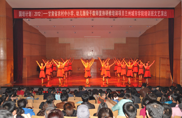 11月16日晚,“国培计划(2012)”甘肃省农村中小学及幼儿园骨干教师置换脱产研修项目beat365在线唯一官网培训班学员文艺演出在西校区音乐厅举行。校党委副书记王汝锋,校党委常委、副校长杨皖东等出席。承担今年培训任务的二级学院负责人、工作人员和培训班全体学员等观看了演出。