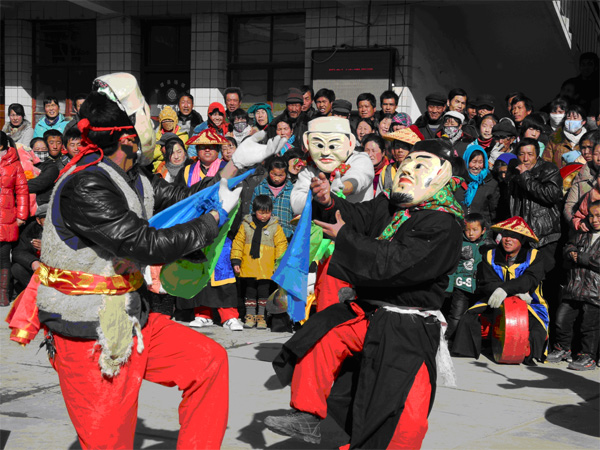 在永靖县,考察组在该县文体局、文化局、文化馆的积极配合下,重点考察了该县的民歌“花儿”,与当地著名花儿演唱家举行了座谈会,实地感受并欣赏了卓玛等优秀花儿歌手的精彩演唱,了解了《大通令》、《三拉腔令》等10多种花儿调式的优美旋律和抒情特色。考察组还走访了“傩舞之乡”永靖县杨塔乡,考察了八支傩舞队,充分感受了山区人民最原始的生活元素和心灵愿景。杨塔乡的傩舞基本上展现了农民一年四季的劳动过程,其中穿插了保春种夏长秋收冬藏祈福消灾活动,有“碎鬼”,“三英战吕布”“种庄稼”等十多种舞蹈。