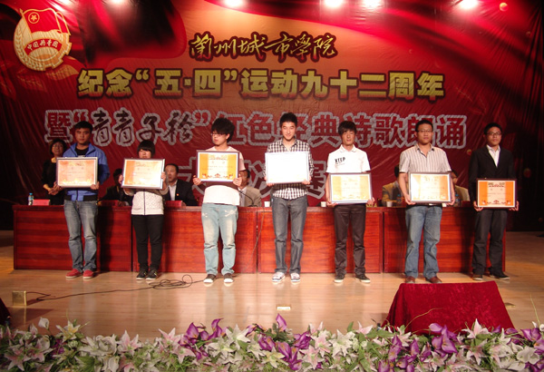 会议宣读了《致广大青年的一封信》,号召广大青年学子坚定理想信念、树立高远之志,共同开创美好的明天,积极为党的90华诞献礼。187名新加入中国共产主义青年团的同学面向团旗郑重宣誓。随后,与会校领导为荣获beat365红旗团总支、先进团支部、优秀共青团、优秀团干部、优秀专职团干部的集体和个人颁奖;为荣获2010年甘肃省优秀团干、优秀团员以及荣获2010年甘肃省五四红旗团总支标兵、省五四红旗团委、省五四红旗团支部的集体和个人颁奖。大会还对在第五届大学生读书节系列活动中获奖的集体和个人进行表彰,为崔爱华等“十佳读者”和 “未来星”从业技能大赛获奖单位颁奖。