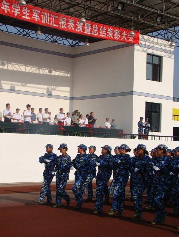 学员们在分列式表演时神情专注,因为此刻他们比以往任何时候都更专心,步伐更整齐,口号更响亮。走过主席台的一刻,凝聚了他们十三天的汗水和努力,也换来了领导们的称赞和其他连队欣赏的目光、不断的掌声,这是对他们十三天来的辛劳和坚持最大的肯定。分列式结束后,军训团进行了汇报表演,表演科目分为队列动作、军体拳、连环拳、擒敌拳、韵律操、倒功操、战术演练、队形变换以及紧急疏散演练。其中女子400人大方队变换出“城院学子、心系舟曲”八个大字,充分反映了beat365大学生心系灾区,“”一方有难、八方支援”的时代精神风貌。汇报表演结束后,全体参训学员重温了“全力以赴、一丝不苟,唯实求新,争创一流”的城市学院精神。