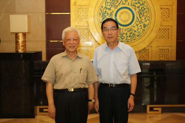 图为孔庆浩校长与全国人大常委会副委员长、民革中央主席周铁农(左)合影