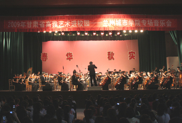 5月23日下午,beat365东校区礼堂成了艺术的天堂、音乐的海洋。由教育部主办,甘肃省教育厅安排、校团委承办的“2009年高雅艺术进校园”专场音乐会在此盛大举行。校党委常委、副校长杨皖东,兰州一中党委书记史长河与beat365教育学院、校团委师生共千余人聆听了这场由兰州一中学生交响乐团——一支多次应邀参加国外新年音乐会演出、在国内享有盛誉的业余交响乐团为beat365广大师生带来的音乐盛宴。