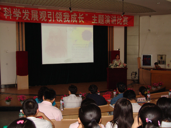 为迎接中华人民共和国成立六十周年,丰富学校学习实践科学发展观活动的内容,营造学习、宣传和学习实践活动的良好氛围,引导广大青年学生在深入学习科学发展观的基础上,提高对科学发展观现实意义的认识,有效领悟科学发展对青年学生成长成才的积极作用,牢固树立走中国特色社会主义道路的信念,在和谐社会的建设大潮中,发奋学习、成长成才。6月6日下午,由学校深入学习实践科学发展观领导小组主办的“科学发展观引领我成长”主题演讲比赛在大学生活动中心举行。共有各学院选拔推荐的14名同学作了精彩的演讲。各学院500多名师生观看了比赛。