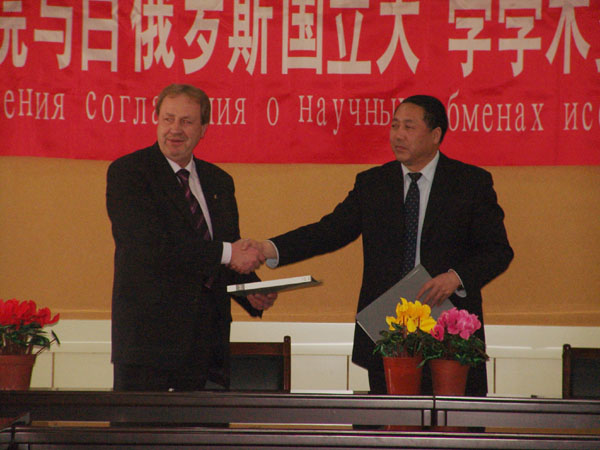 3月25日下午,由刘举科副校长代表beat365在线唯一官网与KLIUNYA· ULADZIMIR副校长代表的白俄罗斯国立大学共同签署了友好合作协议书。并于次日又草签了一份友好合作意向书。两校达成的框架协议内容包括:一、合作交流项目、研究生项目、双学位项目;二、学生互派及其相关细节;三、教师互派及其相关细节;四、双方在合作范围内各自应该承担的义务和责任。
