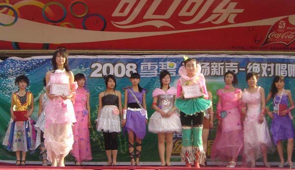 为倡导绿色健康的生活方式和科学的消费理念,在全校上下形成“节约也是一种教养”的共识。校团委、学生会于4月19日下午在9#学生公寓楼前举办了第二届构建节约型和谐校园系列活动之“废物利用时装秀”服装制作及模特大赛。校团委书记杨海东、副书记石虹及校团委、数学系、体育系等院系十余位老师担任了评委,同时,还从观众席中选出了30名大众评审参与。本次比赛要求参赛模特身着同学们亲自动手,用废旧材料制作的环保型服装,进行了个性展示。