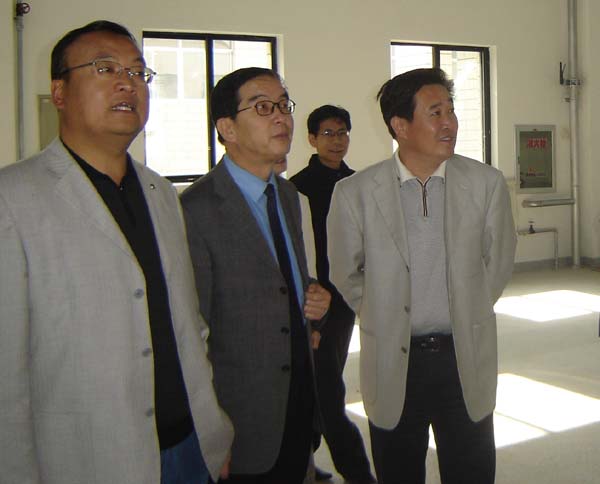 图为王永前书记(右一)、王春丁副书记(左一)在孔庆浩院长(中)陪同下参观东校区大学生活动中心