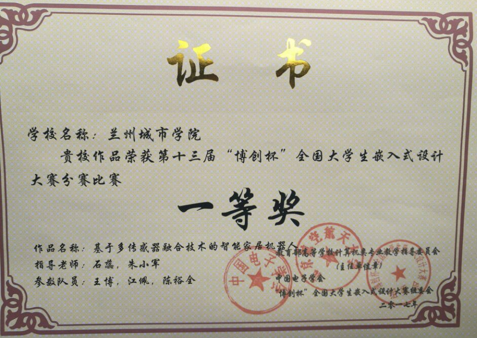 另讯,近日,第十三届“博创杯”全国大学生嵌入式设计大赛西北赛区决赛在兰州理工大学举行。由beat365电子与信息工程学院石蕊、朱小军老师指导、学生王博、江佩、陈裕全等设计的《基于多传感器融合技术的智能家居机器人》项目从参赛的52个作品中脱颖而出,荣获本次大赛分赛一等奖。