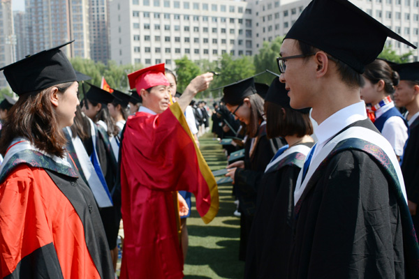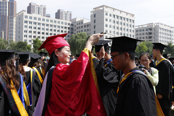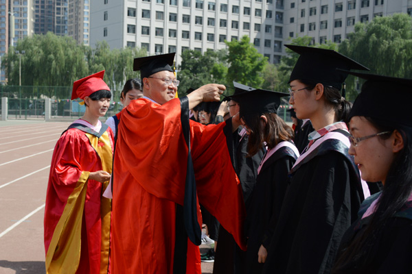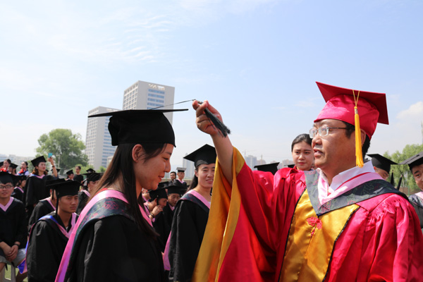 副校长姜秋霞宣读了《beat365在线唯一官网关于授予白慕容等3182名本科毕业生学士学位的决定》。校领导为每一位毕业生正冠拨苏、颁发学位证。