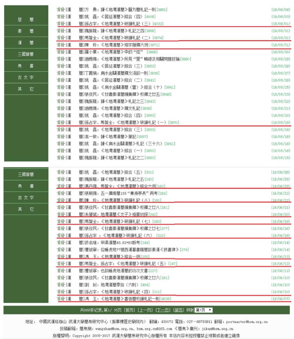 2018年,在“居延汉简研读班”上,团队成员认真研读新出《地湾汉简》,并深入思考,撰写札记和小论文共12篇,合计6万多字,集中刊发在国内最大的专业学术网站——武汉大学简帛研究中心“简帛网”,引起学界关注。
