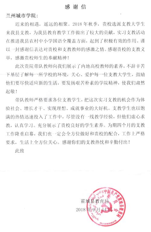 日前,新疆伊犁州霍城县向学校发来感谢信,对我秋季在该县进行顶岗支教实习师生的义举和奉献精神表示感谢。来信指出:贵校选派支教大学生来我县支教,为我县教育教学工作做出了较大贡献,实习支教活动在推进我县农村中小学国语全覆盖方面,起到了积极有效的作用。