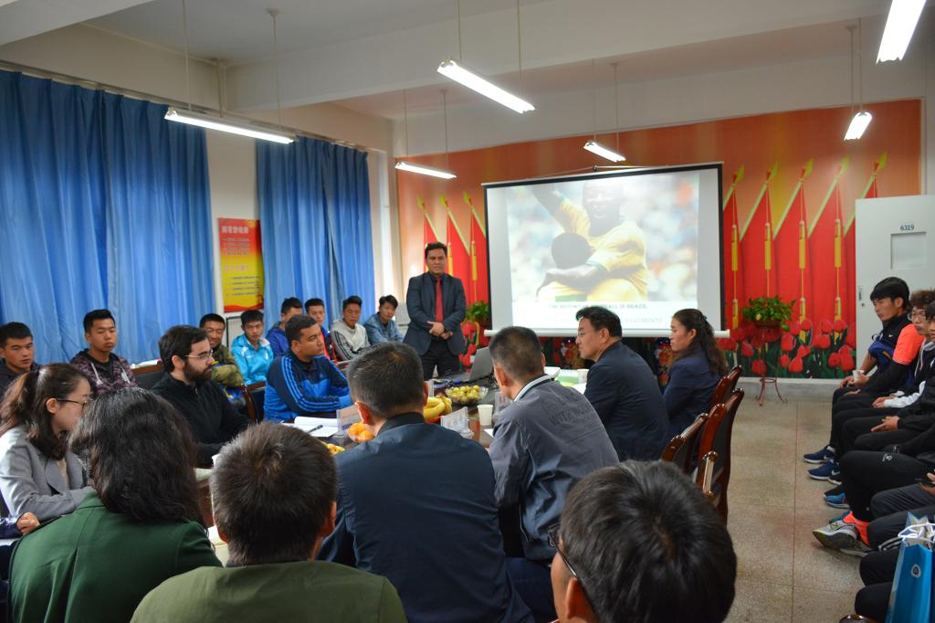 马库斯·纳兹蒙托教授一行为体育学院师生作了题为“巴西足球文化、教学、训练理念为主题”的理论实践相结合的专项学术报告。报告中,马库斯教授对巴西足球的起源和发展进行了介绍,并讲解阐述了不同时期巴西足球的发展历程,即从初级的艺术足球转向中期的力量型足球,最终转变为现代的科学化足球。拉萨罗·德奥利维拉先生重点讲解了五人制足球在推动巴西足球发展过程中不可或缺的作用,并在实践课教学中以其生动形象的情景教学模式,让师生大开眼界,受益匪浅。