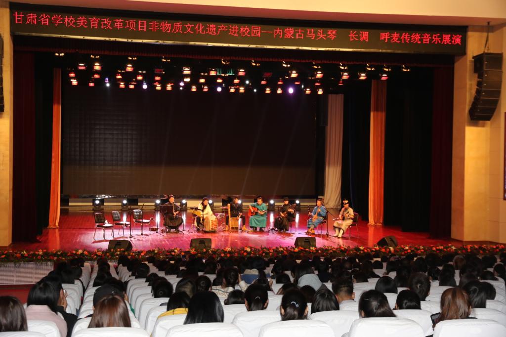 由甘肃省教育厅主办,甘肃省民族音乐研究中心承办,西北民族大学音乐学院倾力出演的甘肃省学校美育改革项目非物质文化遗产进校园“内蒙古马头琴、呼麦、长调甘肃省学校展演”活动,近日分别在陇东学院、天水师范学院成功举办。
