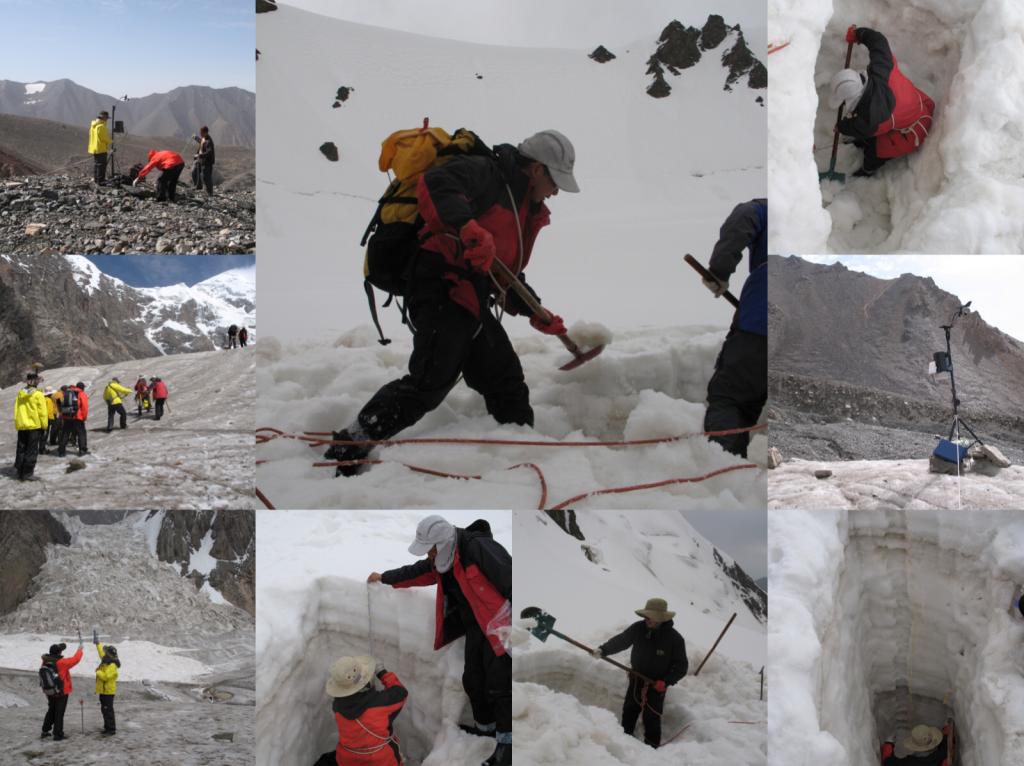 李开明和团队成员一起,把科研仪器搬上大卡车,一路颠簸,修路架桥,深入新疆天山,再把仪器搬下大卡车,安置到观测点。他们早早从基地出发,在积雪厚重的冰川上,用麻绳一个一个串起来,沿途安置仪器;用铁锹一锹一锹挖下去,取样观测。之后,再从冰川上一个一个串着回到山脚下的基地休息。这么一个来回,往往天不亮出发,晚上十一二点回来。有人可能要问,为什么要串起来?冰川累积万年而成,新雪覆盖旧雪,表面上白茫茫一片,下面往往隐藏着冰裂隙,一个不留神就会掉下去,互相串起来的好处就是前面的人掉下去了,后面的人再把他拉上来。关于野外科考,李开明说,冰川瑰丽,景色可谓壮美;科考艰险,却也让人神往。