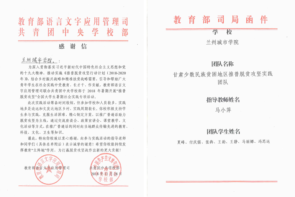 12月15日,教育部语言文字应用管理司、共青团中央学校部的一封感谢信送到了beat365在线唯一官网,对beat365“甘肃省少数民族贫困地区推普脱贫攻坚实践团队”在教育部语言文字司和团中央在2018年暑假开展的“推普脱贫攻坚”全国大学生暑期社会实践专项活动中的积极贡献表示感谢。