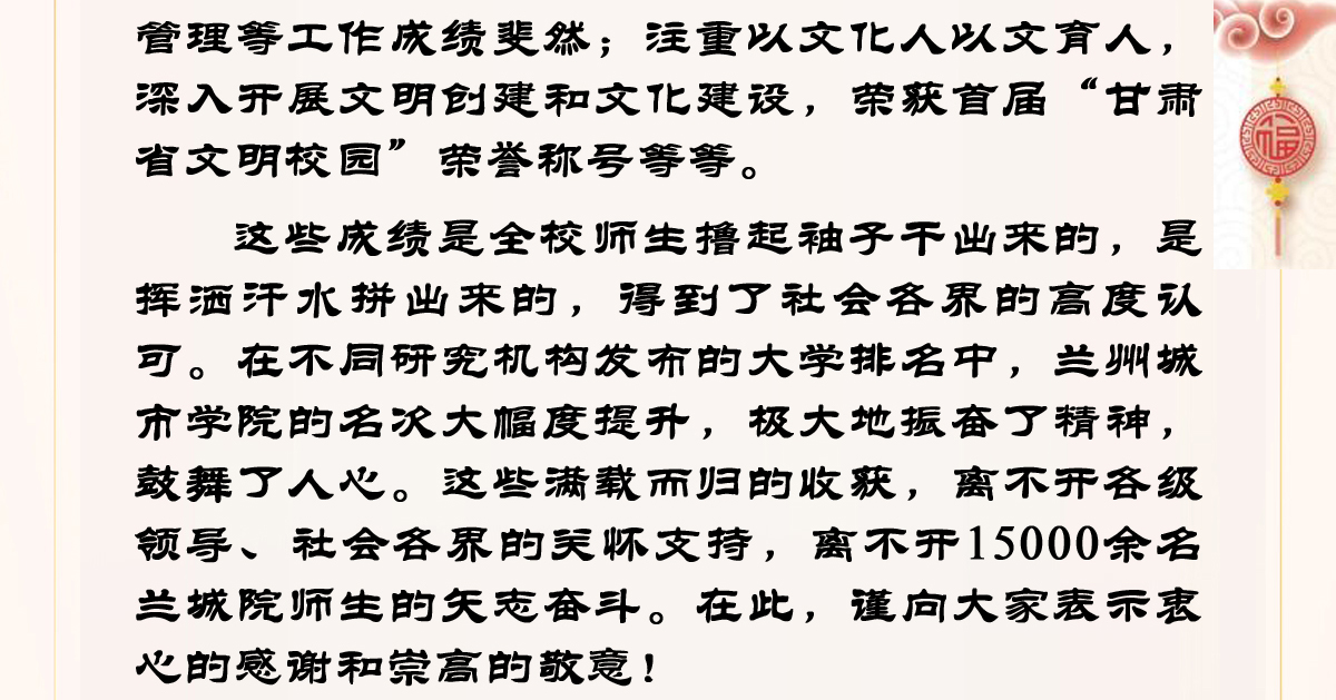 beat365在线唯一官网是2006年经教育部批准,优化整合重组路易·艾黎1942年创办的培黎石油学校、1958年成立的兰州师范高等专科学校、甘肃省幼儿师范学校而成的、西北地区唯一一所以服务城市发展为办学目标的应用型普通本科院校,2010年获批学士学位授予单位,2014年通过教育部本科教学工作合格评估,2017年列为硕士学位立项建设单位。