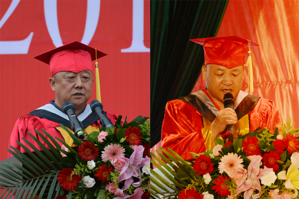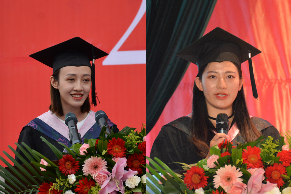 典礼上,化学化工学院赵国虎教授、电子与信息工程学院雒向东教授代表老师分别发言,向毕业生送去了亲切叮嘱和美好祝愿。传媒学院播音154班陈美声、美术与设计学院视觉151班徐敏代表2019届毕业生分别发言,感谢母校的培育之恩,并祝愿母校明天更美好。